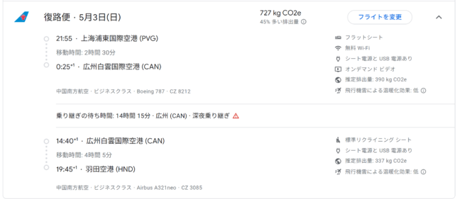 復路は5/3憲法記念日の夜21:55に上海を出発し、0:25に広州に到着。14時間後の翌日、5/4みどりの日14:40に広州を出発し、羽田に19:45に到着します。