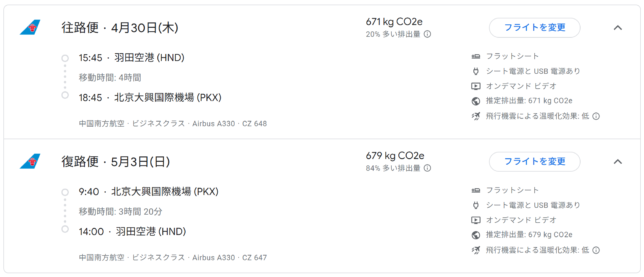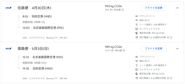 こちらは同じく4/30昭和の日に羽田を出発し、北京まで4時間ほどA330のフルフラットビジネスクラスを堪能し、5/3に同じルートで帰国します。