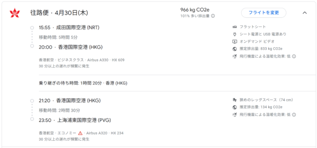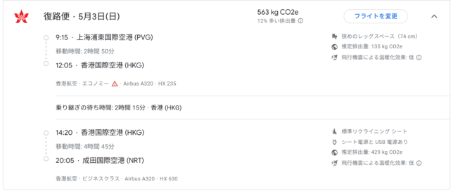 復路は5/3憲法記念日の朝9:15に上海を出発し、12:05に香港に到着。2時間15分の乗り継ぎ後、14:20に香港を出発し、成田に20:05に到着します。
