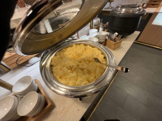 スクランブルエッグの隣に見える暖かそうなジャーはスープくらいはあるかと思いましたが、なんとオートミールでした。