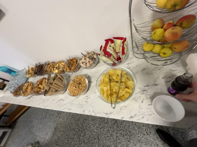早朝便利用であり朝食の時間帯でしたが、ホットミールは一切なし。スナックとリンゴ、袋に入ったチョコクロワッサンがあるのみでした。朝でもこの充実度はなかなか残念です。
