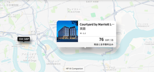 値段はいつもおおよそ£150を下回ることが多いです。空港徒歩圏内ということで中心地からは離れてしまいますが、この時は15,000円ほどとロンドンにあるマリオット系列としては破格の値段で泊まることが可能です。
