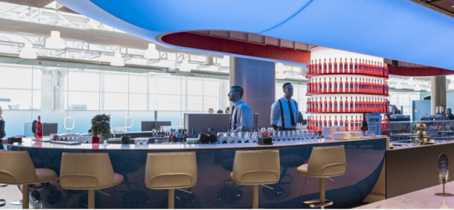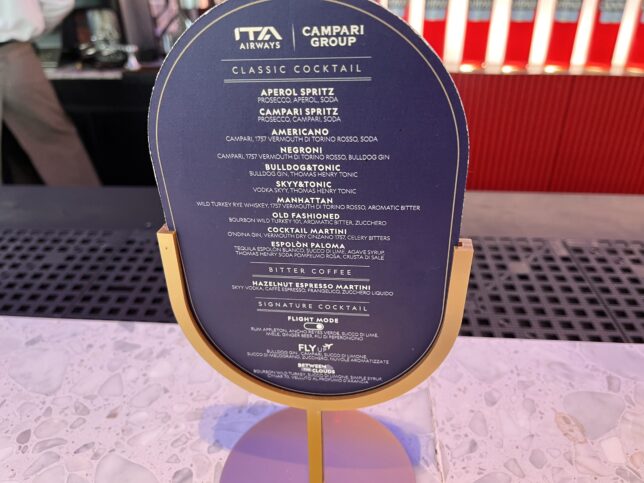 ITAエアウェイズのブランドカラーである鮮やかなブルーを基調とした、モダンで洗練されたデザインが特徴です。特に、カンパリの赤いボトルが整然と並ぶ円柱状の棚が印象的なバーカウンターは、イタリアの活気ある社交場を彷彿とさせ、搭乗前のひとときを華やかに彩ります。